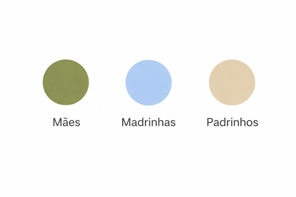 Pedimos apenas um cuidado carinhoso: que evitem usar cores iguais às da paleta escolhida para as madrinhas, padrinhos e mãe, para manter a harmonia visual da cerimônia.